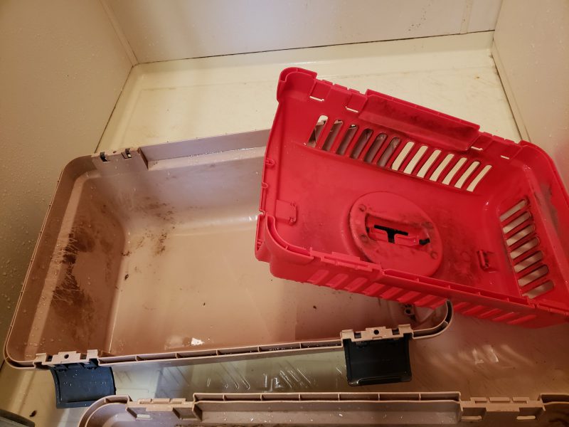 犬達が入れられていたキャリーケースは、水で流しただけでは落ちない、こびり付いた汚れがたくさん。