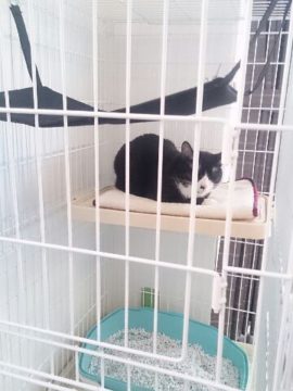 里親さんのご自宅では、家に来てしばらくは緊張でカチコチでしたが、最近はリラックスした様子でケージの中で過ごしているそうです。