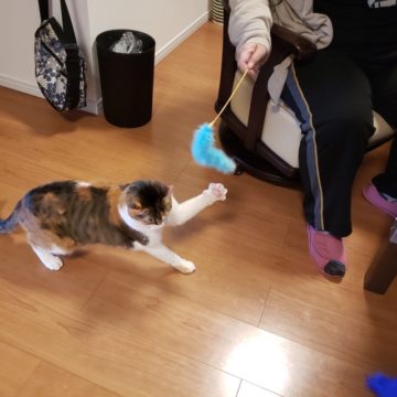 お母さんのオモチャでじゃれて遊びましたが、ふとしたときにほかの猫ちゃんを思い出すのか、鳴きっぱなしです。