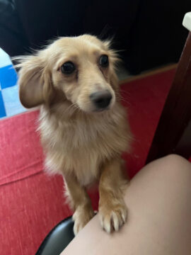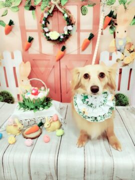 アクアくんは、人とのふれあいが大好きで、人のお膝に乗ることが大好き。同じくお膝が好きなルビーちゃんとは、お膝の取り合いっこが楽しみの一つのようです。人の顔をよく見て行動できる子のため、コマンドの覚えも早く、たった1日で「おすわり」をマスターしました。現在は「まて」や「おて」の練習も順調に進んでおり、日々の練習を通じて成長している姿が見受けられます。