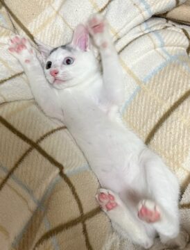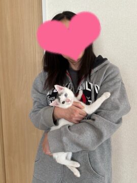 とっても遊び好きで冒険心旺盛です。新しい環境に対しても好奇心旺盛で、いつも何か新しいことを発見しようとしています。可愛らしいお顔にはいつもワクワクした表情があって、元気をもらえます。おもちゃで遊んだり、猫じゃらしで跳ね回ったり、高いケージから飛び降りたりと、エネルギッシュでいつも周囲を明るく、元気にしています。驚くほど社交的で人懐っこい性格で、野良猫さんとして暮らしていた過去を全く感じさせません。