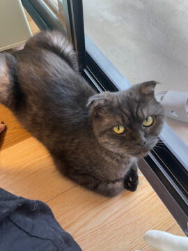甘えん坊のぐりくんは、慣れるとナデナデのトリコになりつつあるので、全身を伸ばしてナデナデしてほしいアピールが上手になりました。ナデナデをやめると、えっ?ナデナデ終わり?とこちらを向いて物足りなさそうなお顔で見つめてきます。警戒心があまりない子なので、いつもそばに寄ってきてくれます。動くものには興味があり、可愛いオテテを一生懸命伸ばして天真爛漫に遊ぶ姿が愛くるしいです。運動後はしっかりと毛繕いして、身だしなみを整え水分補給も忘れずにします。抱っこもお腹を下にしてくれるなら慣れてきました。