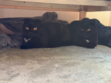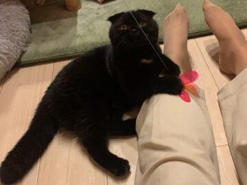 カイくんはまだ人馴れせず距離はあるものの、遊び始めると人に触れるのも大丈夫になりました。ホクくんもカイくんも朝夕おもちゃで遊んでくれており、カイくんはリビングにあるキャットタワーで一日中過ごしています。我々のQOLもぐんと上がり、毎日幸せを噛み締めております。