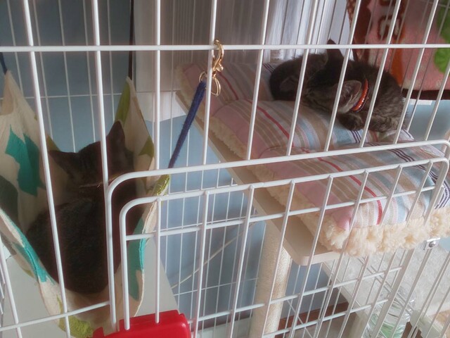 名前ですが カンナちゃん→「ココ」、アンナちゃん→「ミミ」に決定しました。日中は自分たちからケージに入り、それぞれお気に入りの場所で寝ている事が多いです。