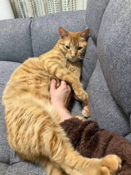 ブラッシングも爪切りもおりこうさんにさせてくれ、自慢のぽにょぽにょのお腹をなでなでして〜♡とアピールして嬉しそうにひっくり返ります。うっとり顔で癒やし効果抜群、抱っこも出来ます。