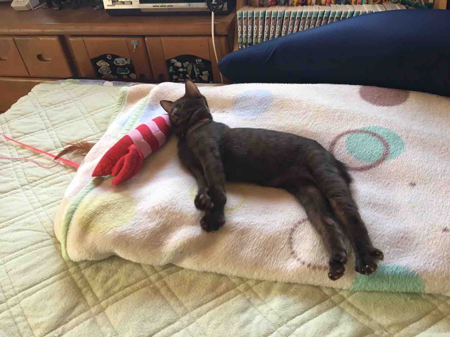 日に日にヤンチャになり、階段を駆け上がり走り回ったり、木登り棒を登ったり、ゲージの上から飛び降りたりととっても元気です。これから先住猫もクマ君も幸せな猫生が送れるよう頑張っていきたいです。