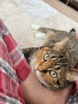 ごはんは人がそばにいると気になって食べにくいようで、自分一人だけになれば安心してごはんを食べています。とくにペーストやスープタイプのごはんが好きです。猫じゃらしで遊ぶのは好きですが、すぐに興味が他に向かってしまいます。遊ぶのは、猫じゃらしやおもちゃが自分の10cm以内の至近距離に来た時の一瞬だけです(笑)抱っこもできますが、長い時間は苦手なようです。過去に怖い経験でもあったのか、ビクビクと臆病になりやすい場面もありますので、これからは素敵な家族と出会って、家族の一員としてたっぷりの愛情に包まれて安心して幸せに暮らしてほしいと願っています。