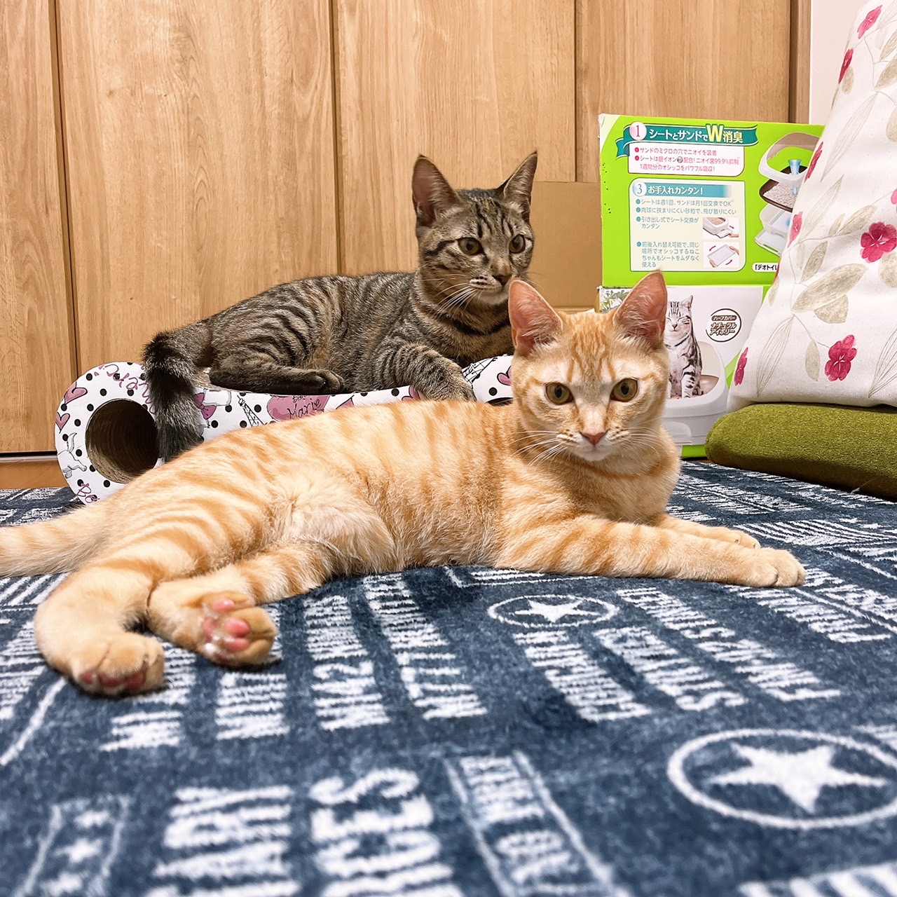お家の環境に慣れてきて、午前中は2人でお家の中を駆け回り、午後には窓際で日向ぼっこをしながらお昼寝をしています✨ご飯の時間になると高い声を出して「お腹すいた〜♪」っと2人で鳴いています😻