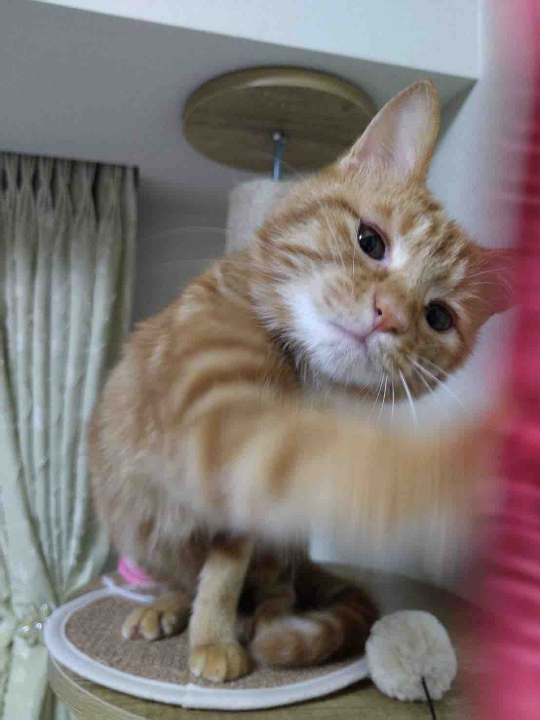 いまは好奇心旺盛で元気いっぱいに遊んでいます。人が大好きな甘えん坊さんで、のどをゴロゴロ鳴らして人に寄り添ってきます。一人であちこち探検するのも大好きで、お部屋をかけまわったり、おもちゃを追いかけたり、とにかく天真爛漫で可愛らしい女の子です。お目目はときどき、美しく鮮やかな深緑に光ります。