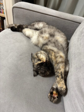 のぞみちゃんをお迎えして、日々可愛いが更新されています。ソファに座っていると乗ってきてごろんとしたり、頭をすりすりしてきたりする姿に癒されています。トイレの姿にさえ笑みが溢れます♡猫ちゃんを迎えるのは初めてで不安もありましたが、家や私たちに慣れてくれて、安心して過ごせていると思うと嬉しいです!のぞみちゃんが幸せいっぱいに過ごせるよう、これからもたくさん可愛がっていきます。