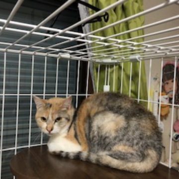 とても怖がりさんです。少しずつ慣れてきていて、頭や体をなでたりできるようになりましたが、まだまだ恐がって丸くなり動こうとしません。走って逃げたり隠れたりすることはないですが、明るい隅っこでおとなしくしていることが多いです。チュールが大好きで、上手にペロペロと舐めることができます。