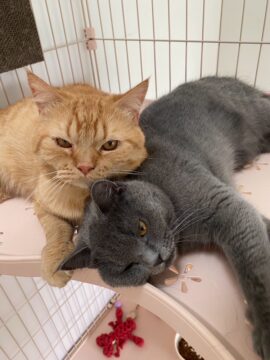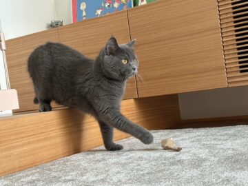 元気にネズミのおもちゃで走り回ったり、ふたりで家の中を探検したりと、健康的にしています。