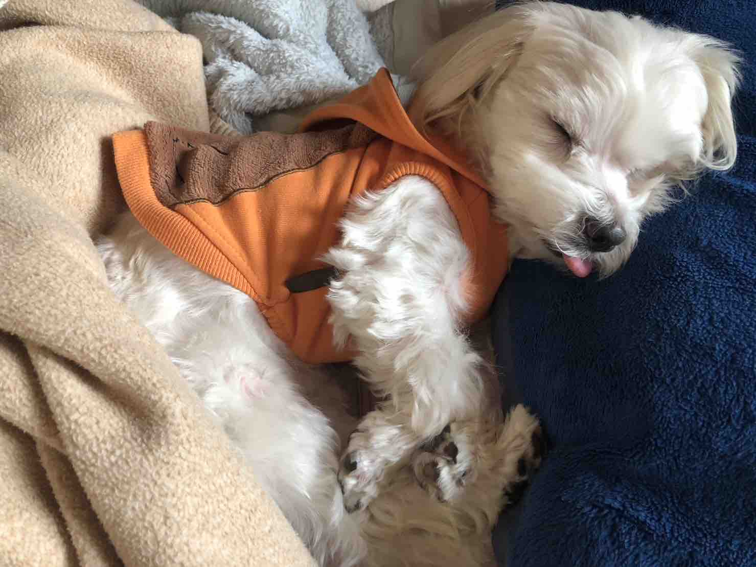 どの子もガリガリに痩せ細っており、全身が糞尿まみれでひどい悪臭を放っていました。被毛の毛玉もひどく、全身にびっしり絡みついて皮膚がひきつれた状態でしたが、私たちボランティアの手で丁寧にはさみで刈り取り、その後やむを得ずバリカンで丸刈りにいたしました。現在は少しずつ毛が伸びてきています。また今回受け入れた子たちの中には、多頭飼育崩壊現場で異物を飲み込んだと思われる子がいることが発覚し、緊急の手術を実施した子(さなちゃん)がおります。この事態にマルチーズ全頭を検査すべきと判断し、11頭のワンちゃんたちが順に動物病院へ通院いたしました。